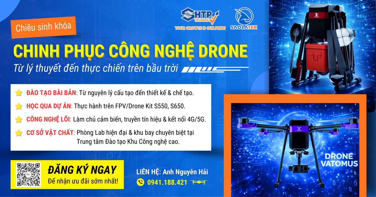 Trong bối cảnh Drone/UAV đang trở thành xu hướng không thể thiếu trong các ngành công nghiệp hiện đại, SHTP Training phối hợp cùng Saolatek mang đến “Khóa học Drone thực chiến” với định hướng giáo dục STEM, đề cao tính Chủ động – Sáng tạo – Kiên trì. Mục tiêu của chúng tôi là giúp học viên không chỉ lái được Drone, mà còn hiểu, chế tạo và ứng dụng công nghệ này vào đời sống.